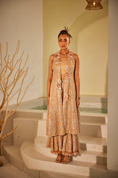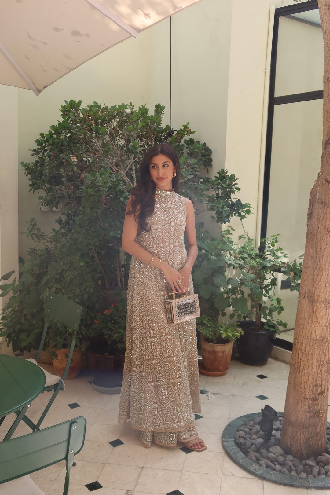 Afshaan in our Hi Neck Long Sleeveless Dress and Sharara Set