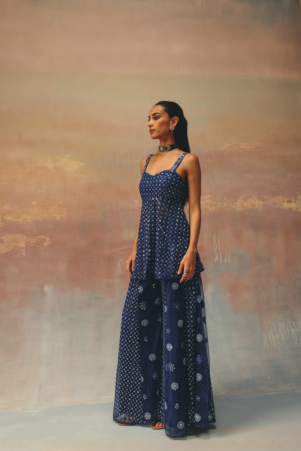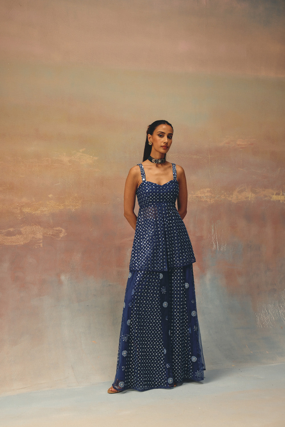 Strappy peplum top With Front Opening with Mirrorwork and Beadwork On The Straps