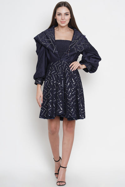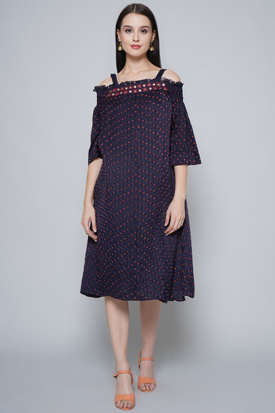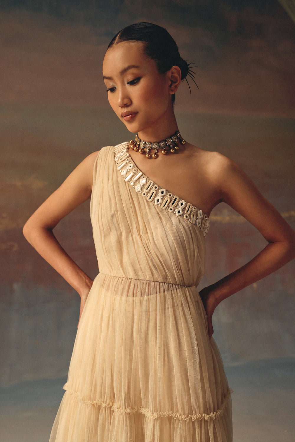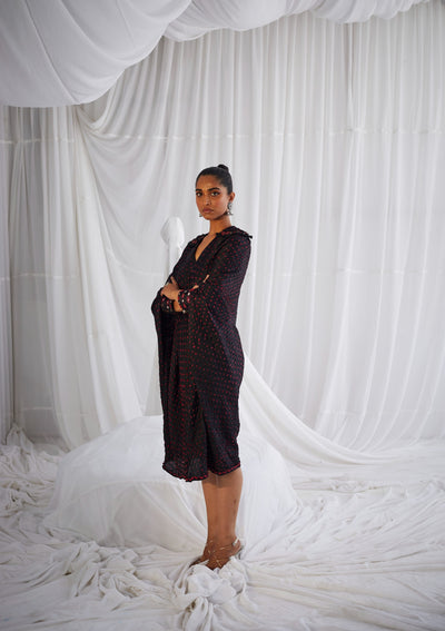 Rabari Power Shoulder Asym Dress in Gajji Silk Bandhani