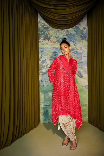 Rabari Asym Hi Neck Dress in Gajji Silk Bandhani With Dart Dhoti Pants