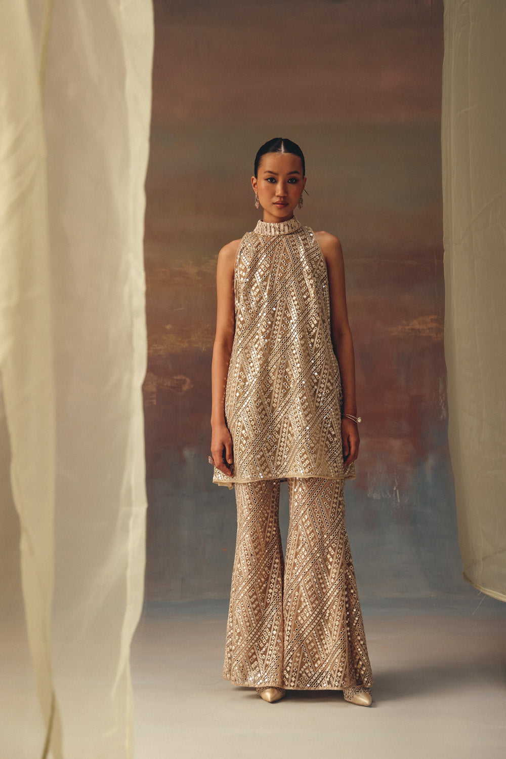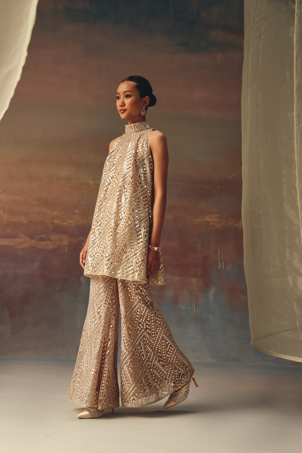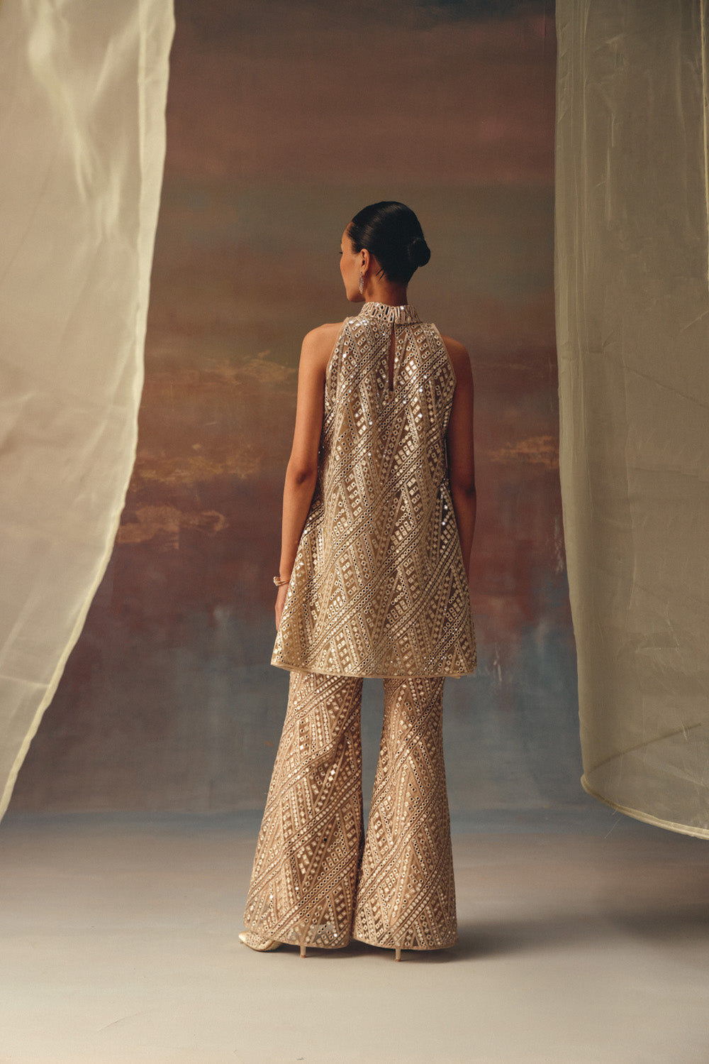 Fabric Details : This Tissue fabric is specially designed by our team giving it a mirrorwork effect and is crafted with great care and precision. The garment is then styled at our workshop with finest details.