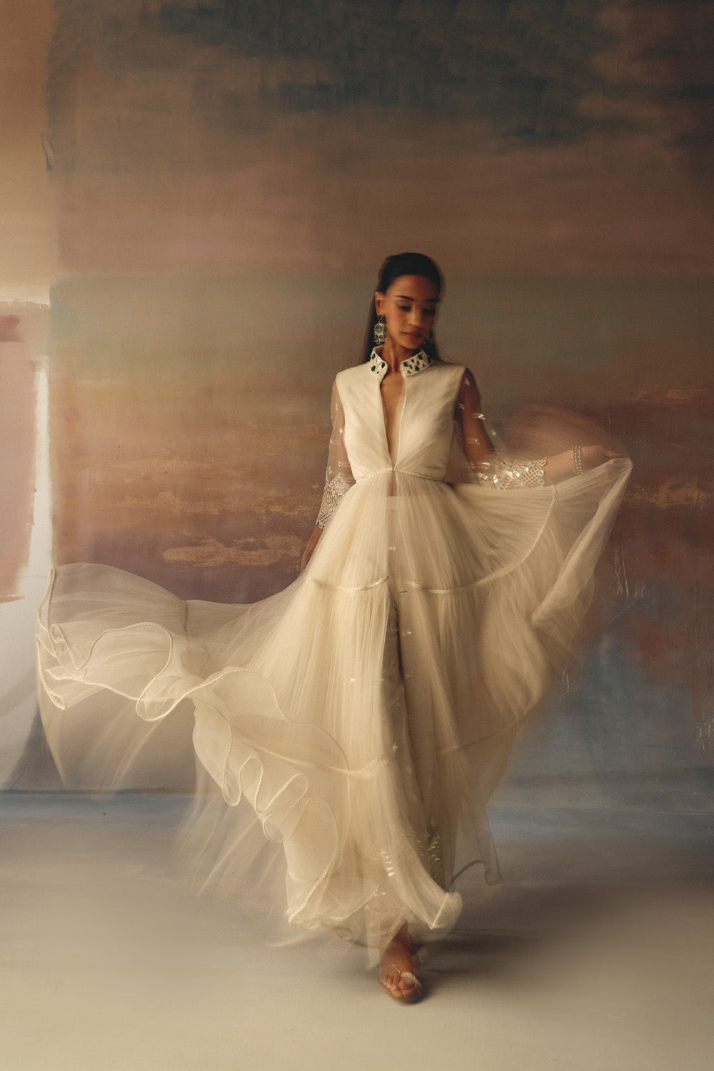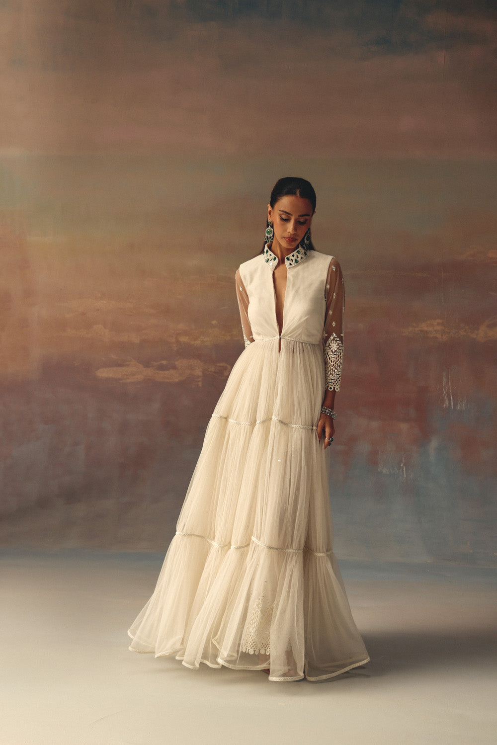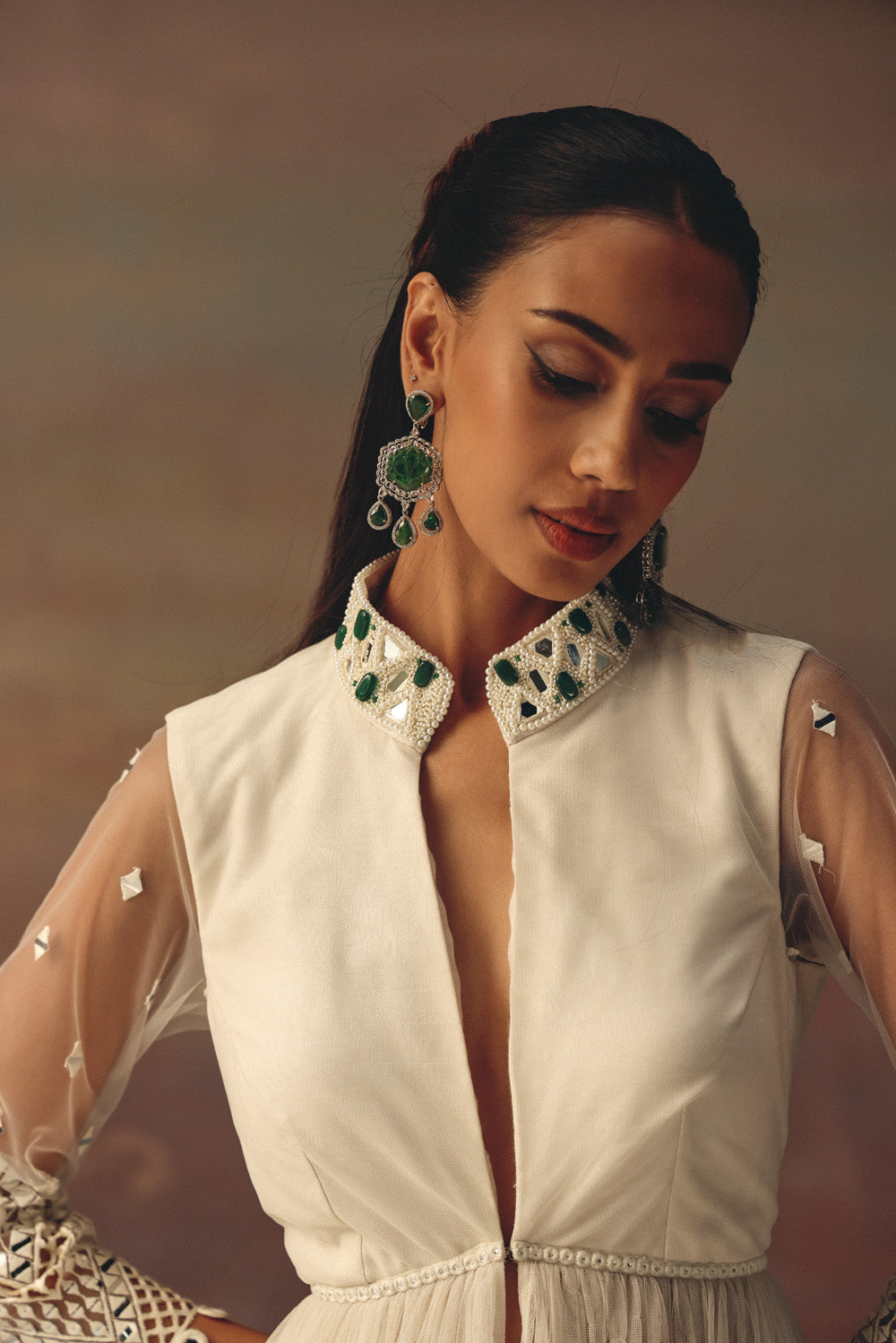 Layered Backless Anarkali Jacket With Mirrorwork And Beadwork