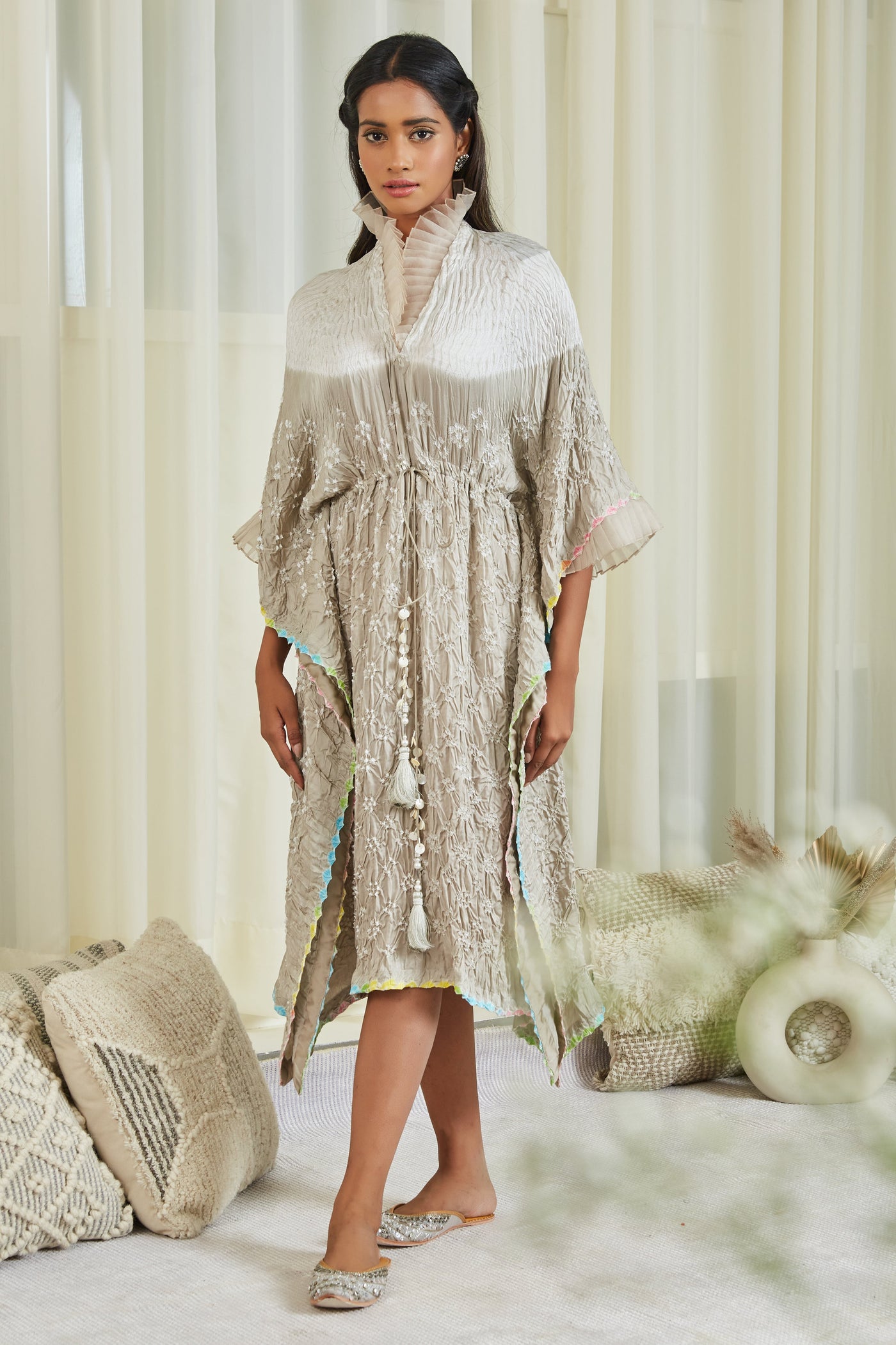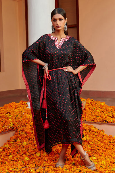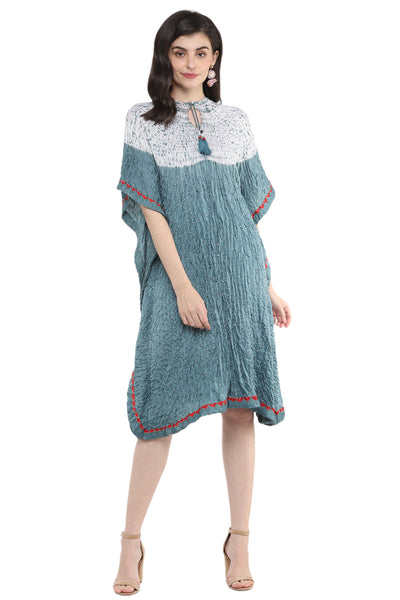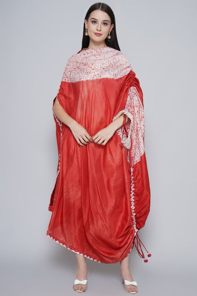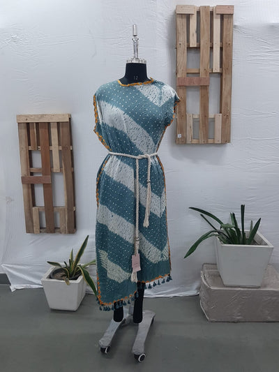 V Shibori Bandhani Boat Neck String Slevees Kaftan with Tasseles