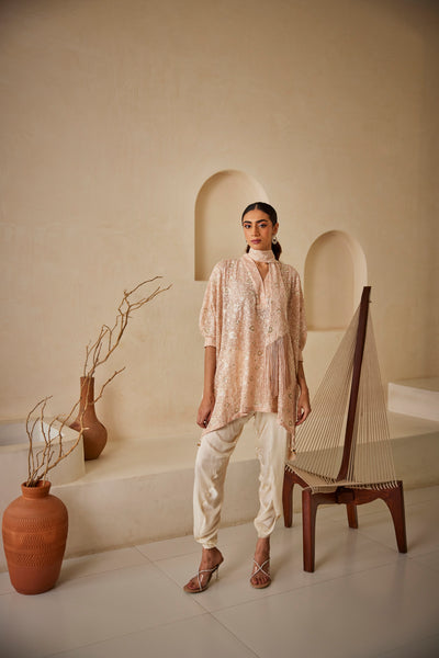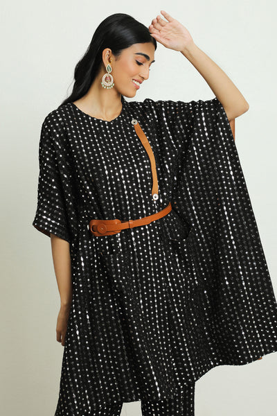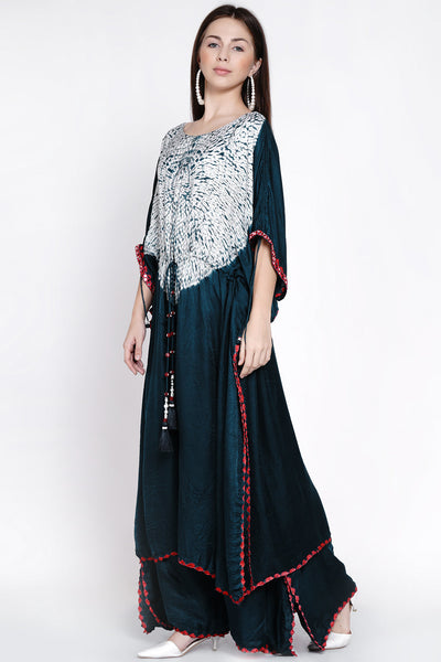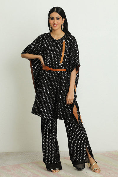Boat Neck String Slevees Kaftan with Mirrorwork Nd Asym Pant Set