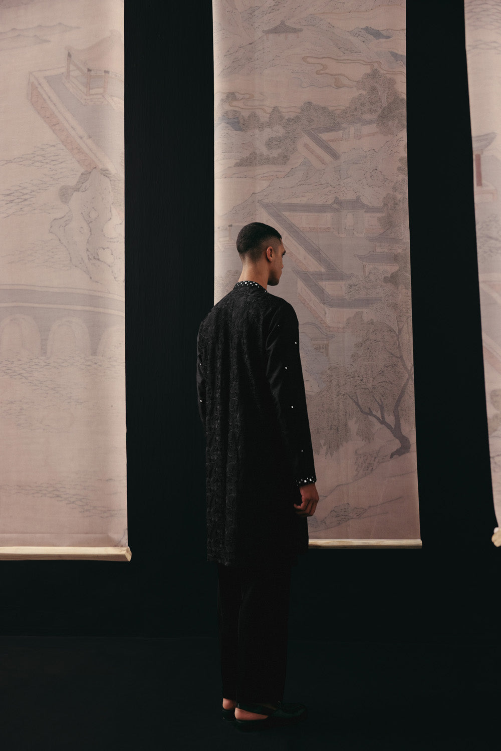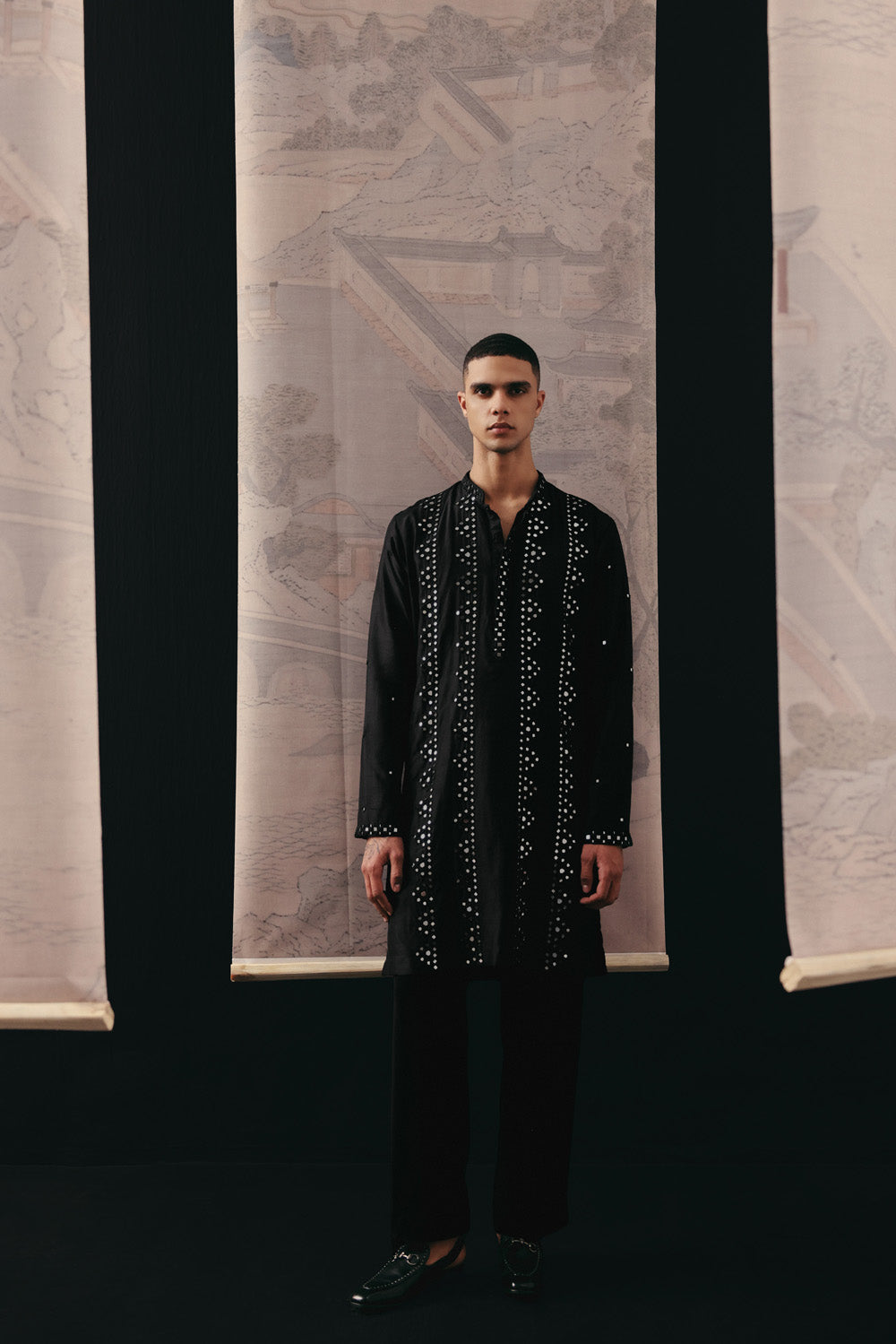Black Dupion Vertical Mirrorwork Jaal Kurta Set With Embroidered Back