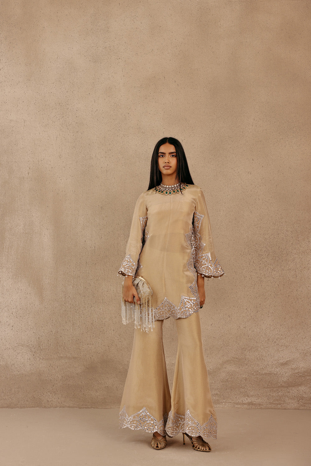 Fabric Details : Zero Neck Silver Zari Mirrorwork Tissue Applique Kurta With Flared Rounded Sleeves