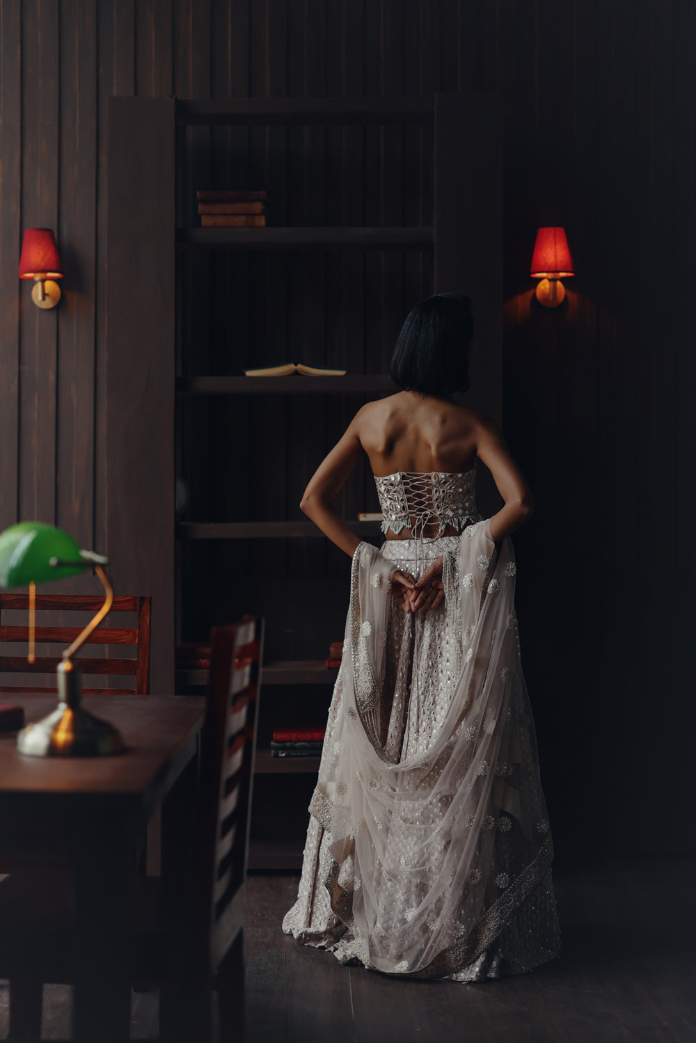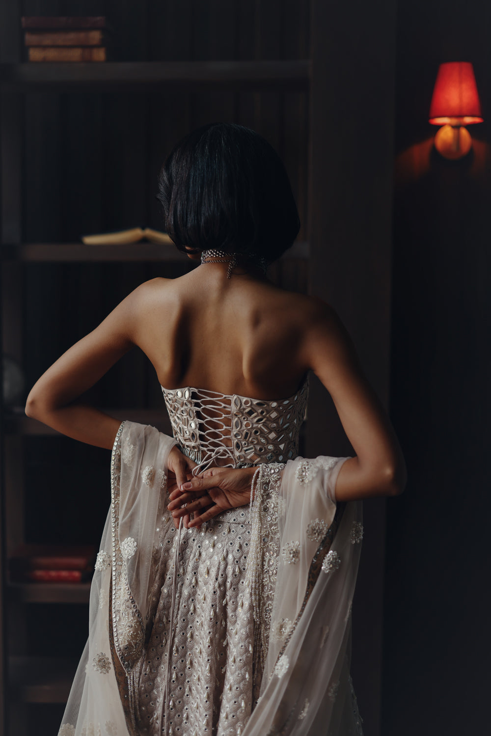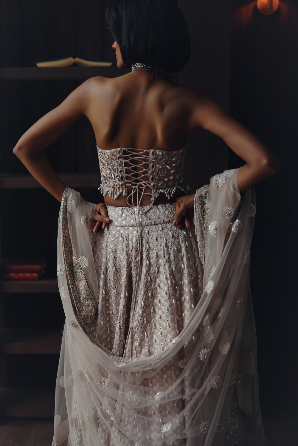 This elegant pearl drop lehenga, featuring delicate hanging pearl thread embroidery that adds a luxurious texture and subtle shimmer. The lehenga skirt is flared, creating graceful movement. It is paired with a mirror embellished corset blouse and a complimenting dupatta.