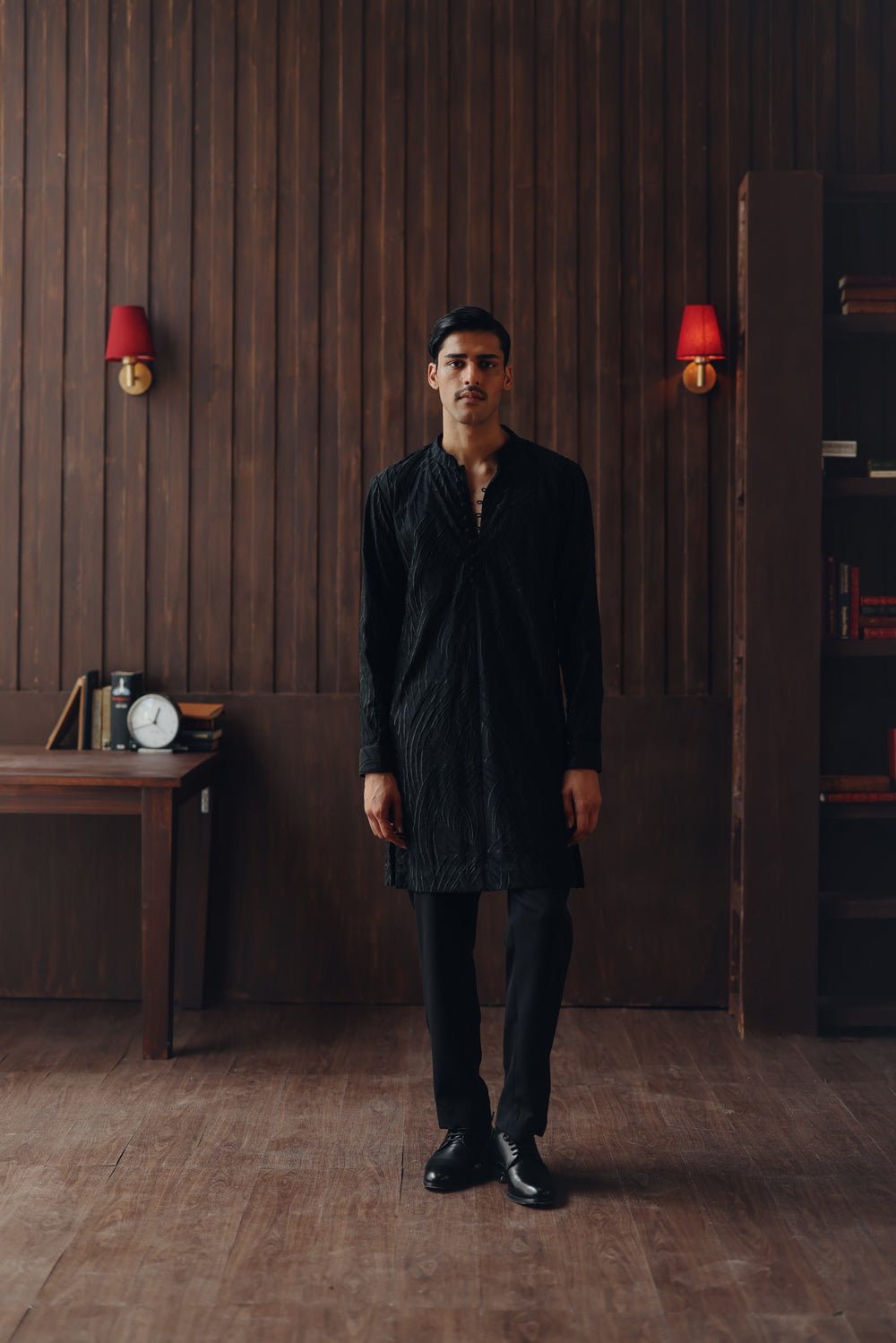 This high neck kurta features intricate resham details, finished with potli buttons for a touch of traditional finesse. It is layered with an ivory cotton silk overlay, intricately hand- embellished with mirrorwork and beadwork that catch the light with quiet sophistication.Paired with Straight pants.