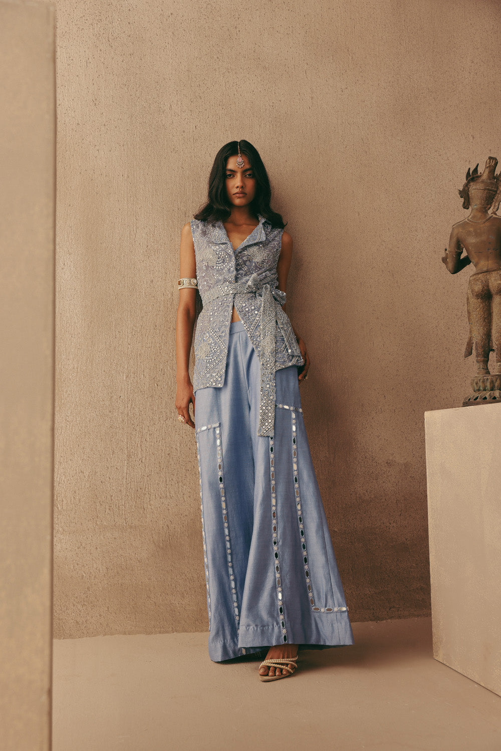 Tissue Ankle Length Palazzos With Mirror Embellished Belt