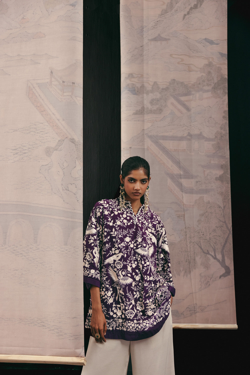 Zero Neck Silver Zari Mirrorwork Tissue Applique Kurta With Flared Rounded Sleeves
