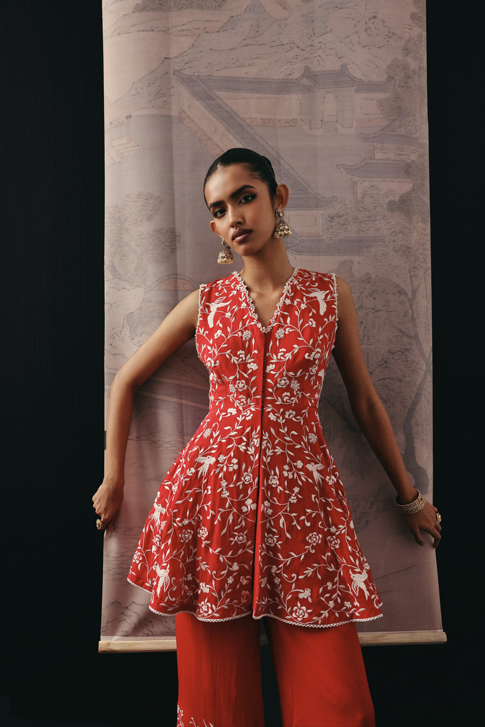 Red Parsi Gaara Lehenga with Cape Jacket and Corset
