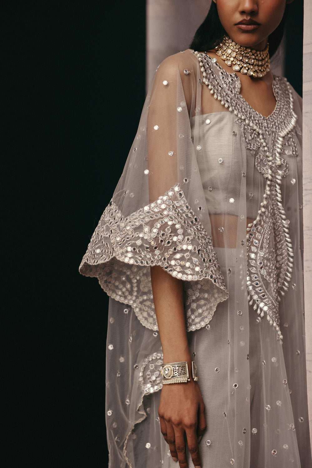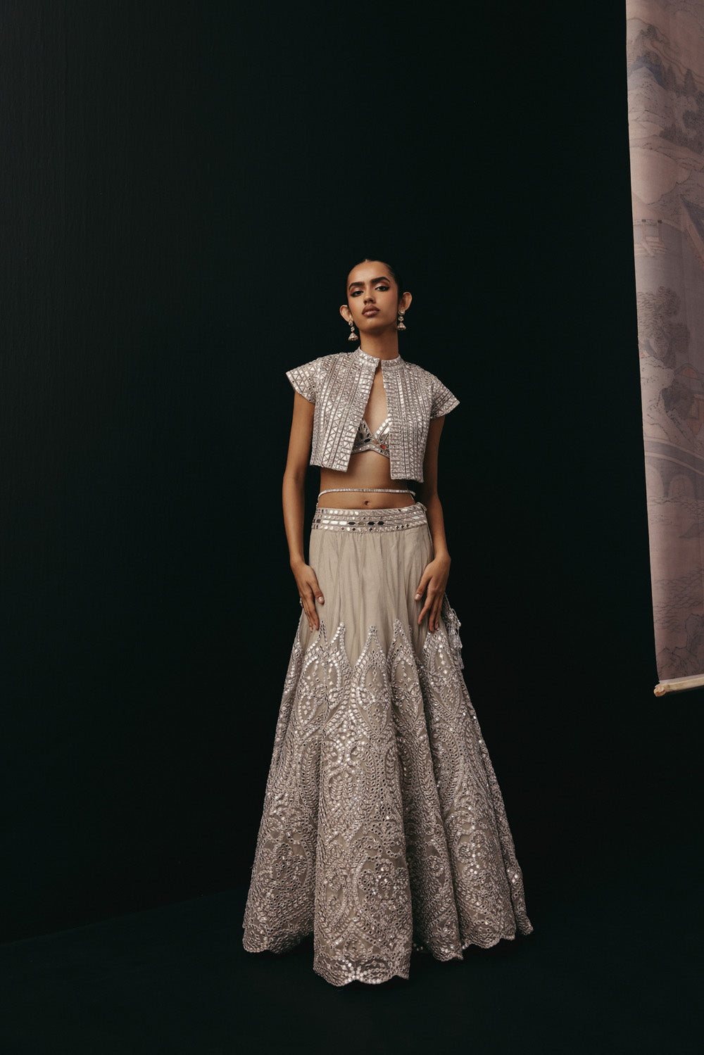 Silver Zari Mirrorwork Lehenga with Cape Sleeves Jacket and Bralette