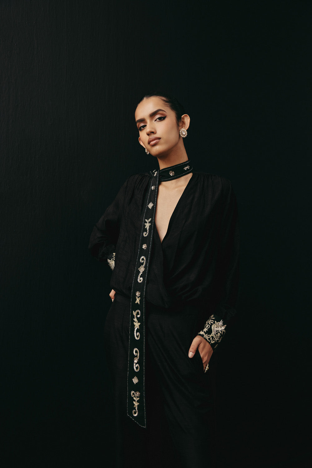 V Neck Black Mirrorwork Tille Applique Kurta With Flared Sleeves
