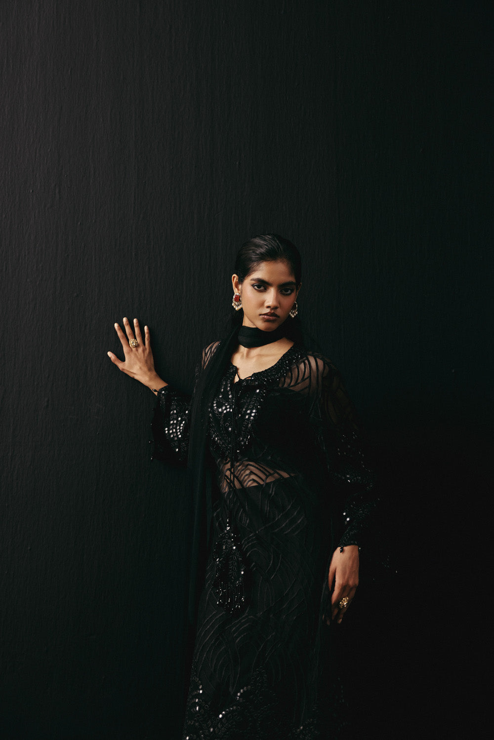 V Neck Silver Zari Mirrorwork Tulle Applique Kaftan