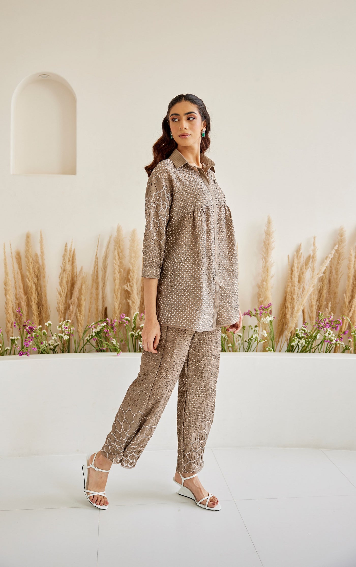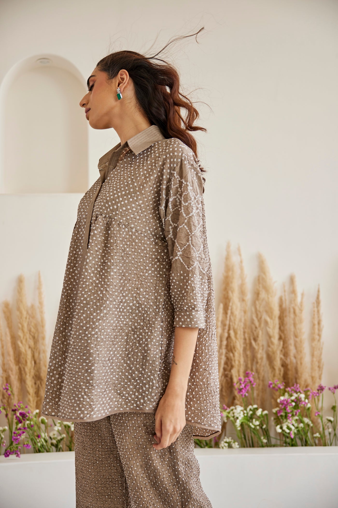 Garment Description : The ensemble is made in hand tied and dyed Crushed Raidana Silk Bandhani, designed by us & crafted by master artisans in Kutch. The garment is designed by our team with great care and precision. We recommend dry clean only.