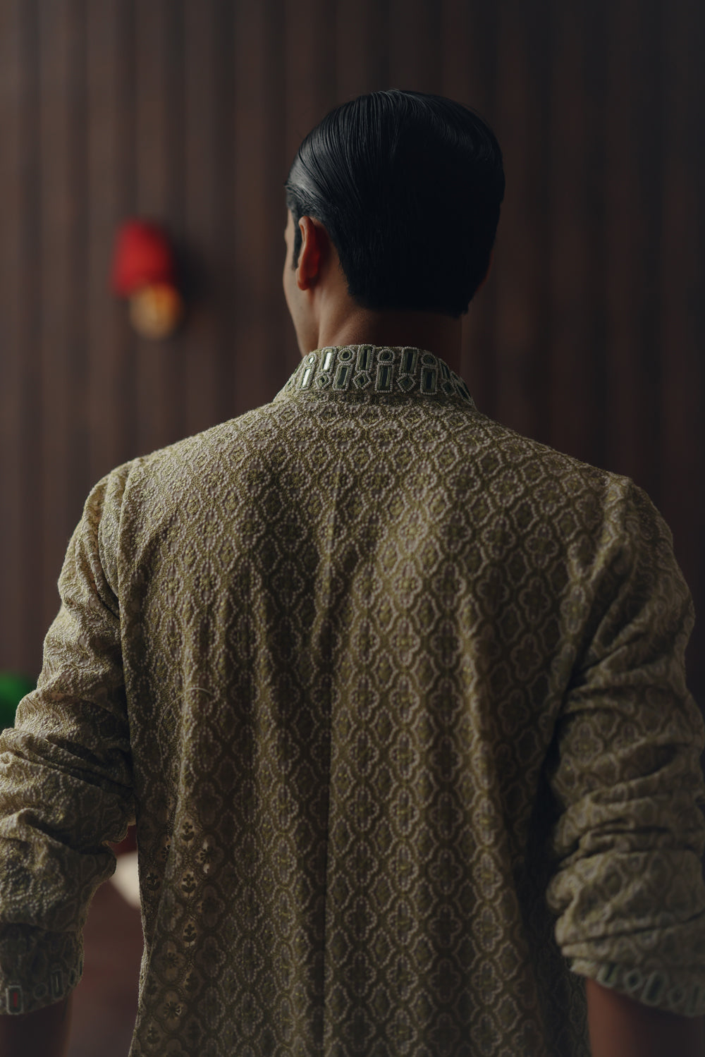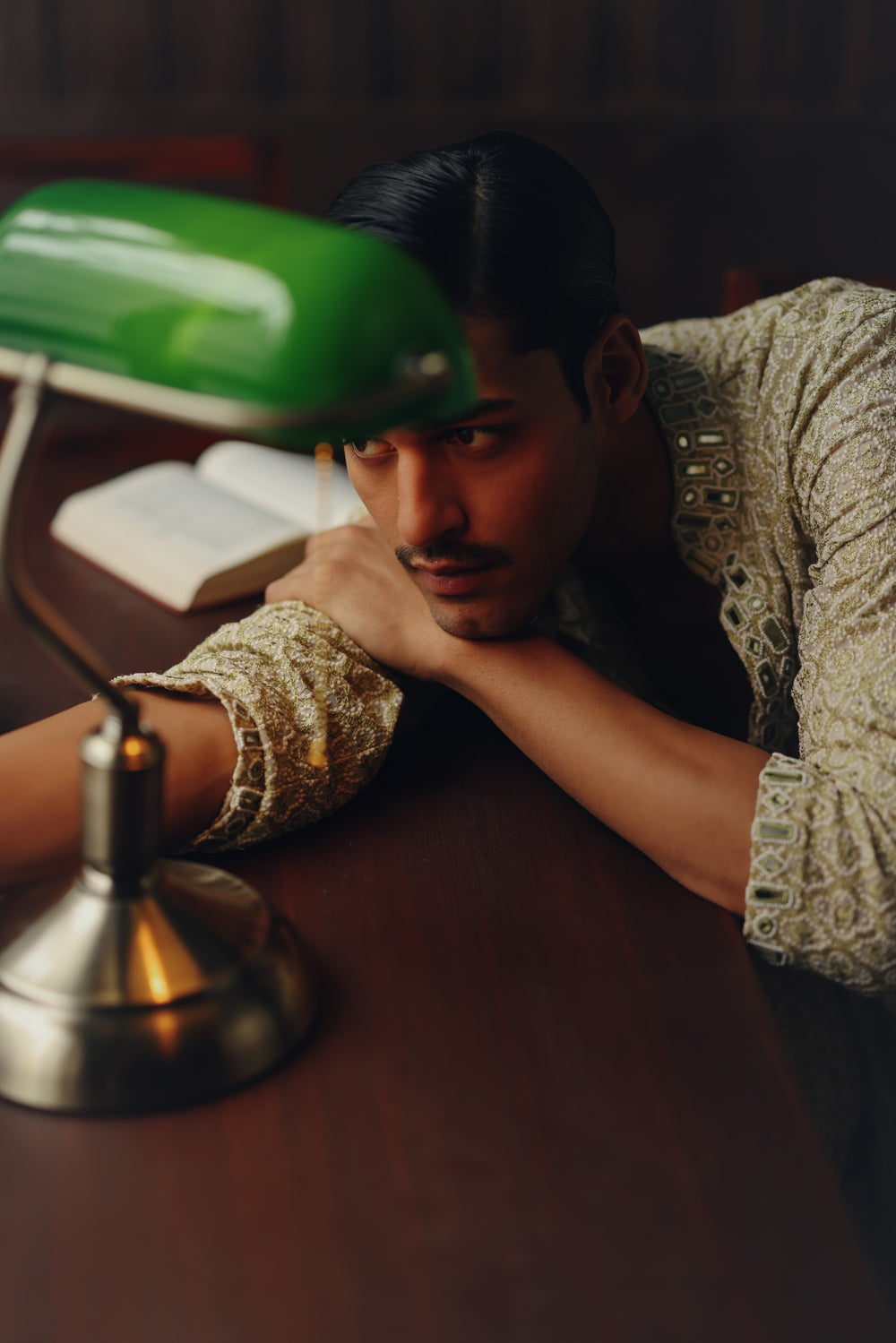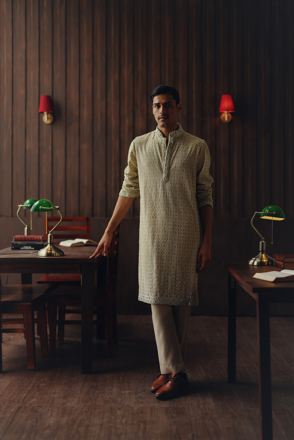 This kurta features a delicate chikankari motif jaal that celebrates traditional craft with a contemporary lens Thoughtfull embellished jaal finishes add a touch of finesse, while mirrorwork and beadwork embelish on the neckline, button placket, and sleeveline with subtle shimmer completes the look. Paired with classic ivory pants.