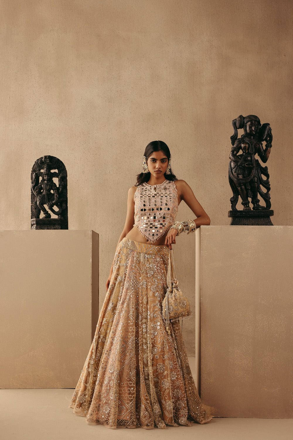 Lehenga: Multicolour, Multi Mirrorwork Fitted Gode/ Conical Lehenga