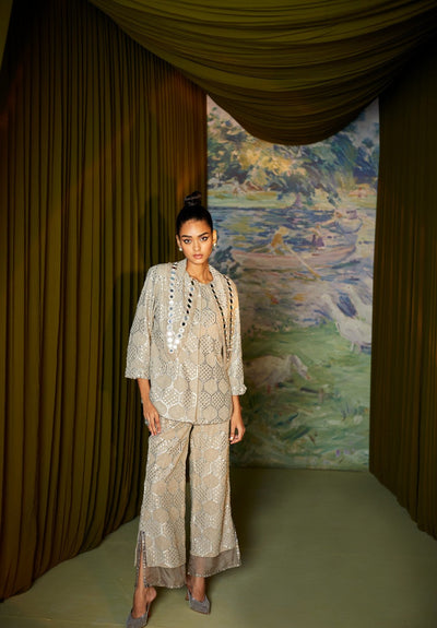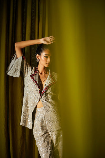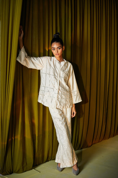 Front Open White Ruffle top With Mirror & Beadwork Paired