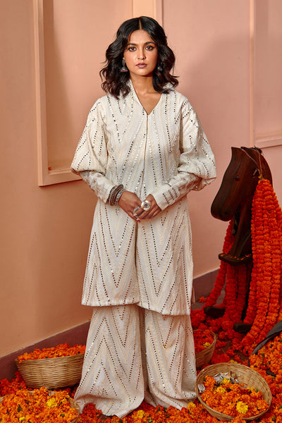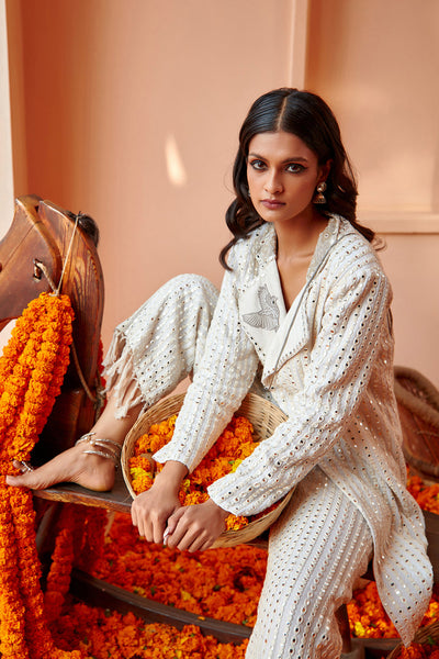 White Semi Circle Mirrorwork Bundi And Kurta Set