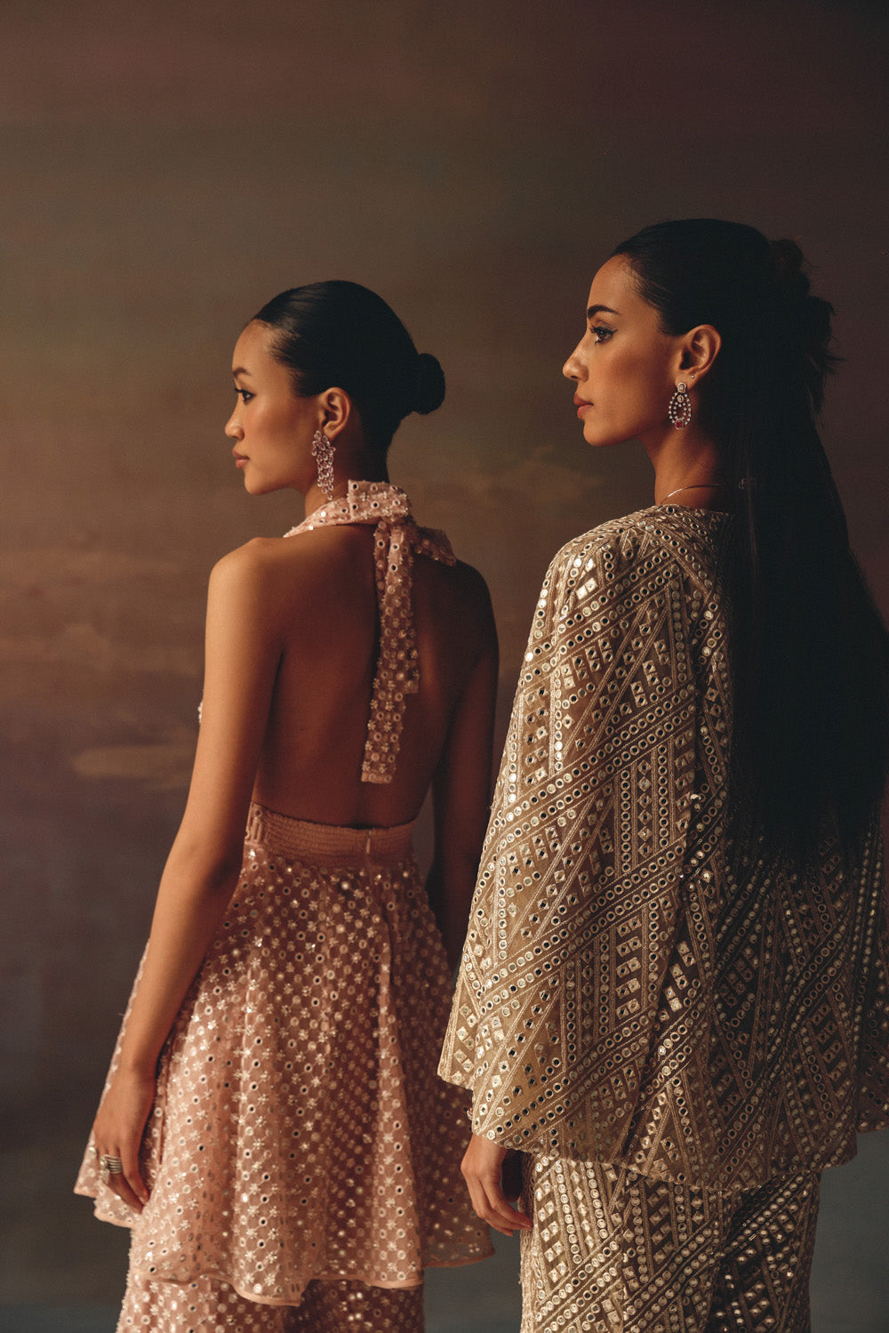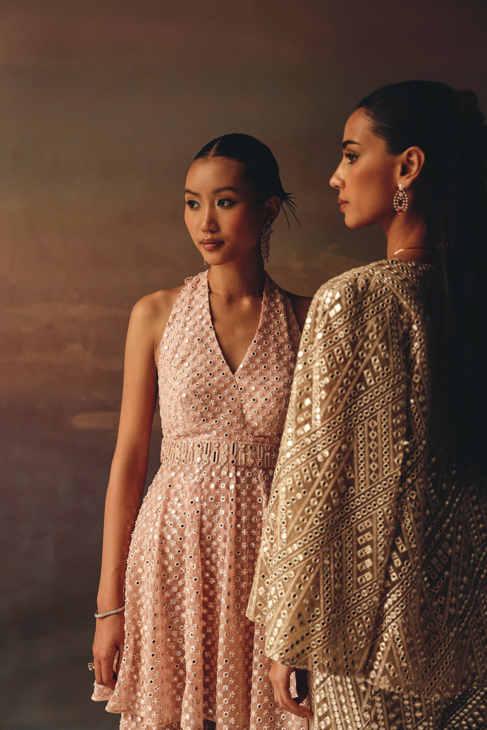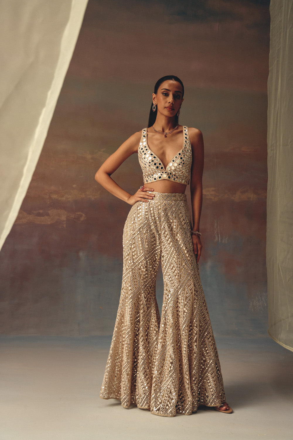 Fabric Details : This golden dia net fabric is specially designed by our team giving it a mirrorwork, beadwork effect and is crafted with great care and precision. The garment is then styled at our workshop with finest details.