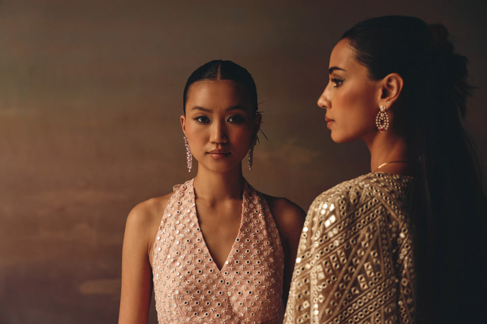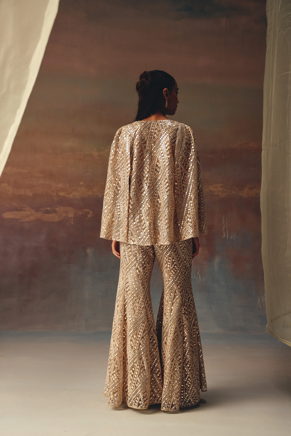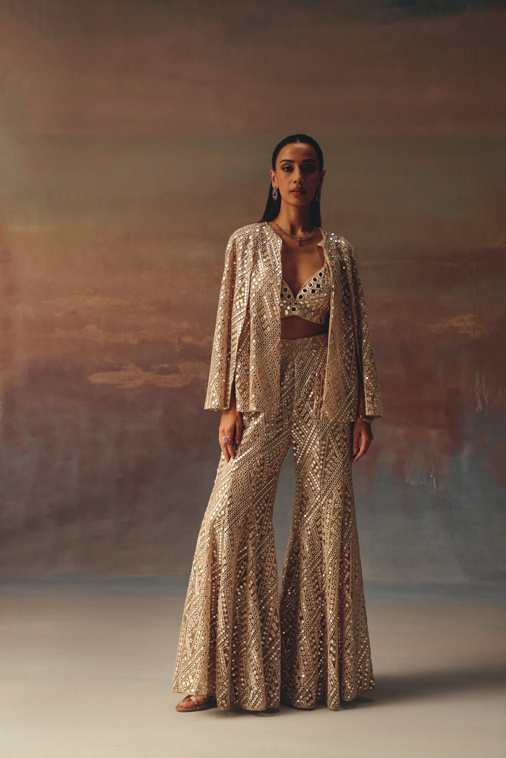 Fabric Details : This golden dia net fabric is specially designed by our team giving it a mirrorwork, beadwork effect and is crafted with great care and precision. The garment is then styled at our workshop with finest details.