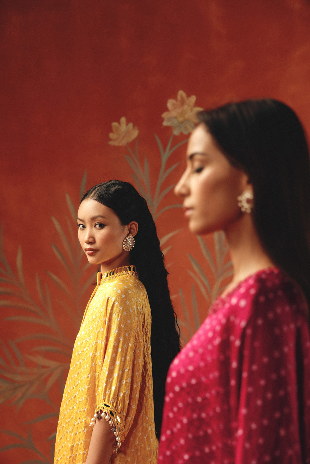 Fabric Details : The ensemble is made in hand tied and dyed Gajji Silk Bandhani fabric designed by us & crafted by master artisans in Kutch. The garment is designed by our team and enhanced with hand embroidered Mirror and Beadwork . We recommend dry clean only.