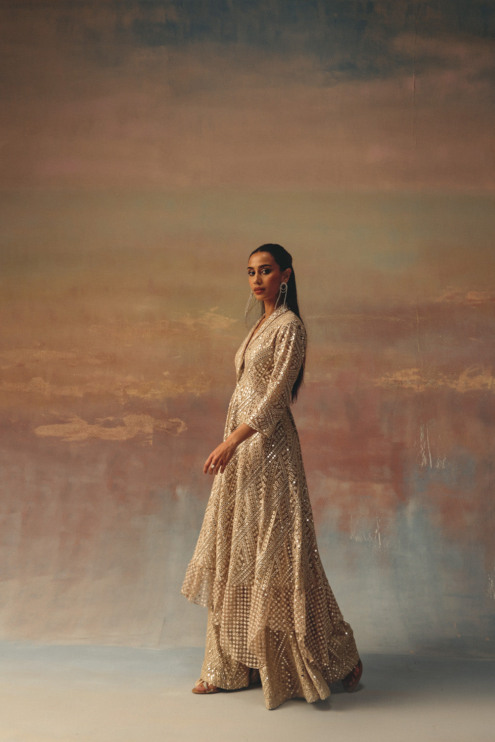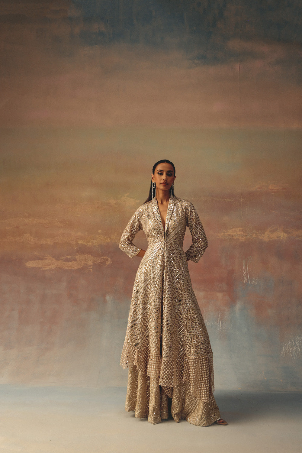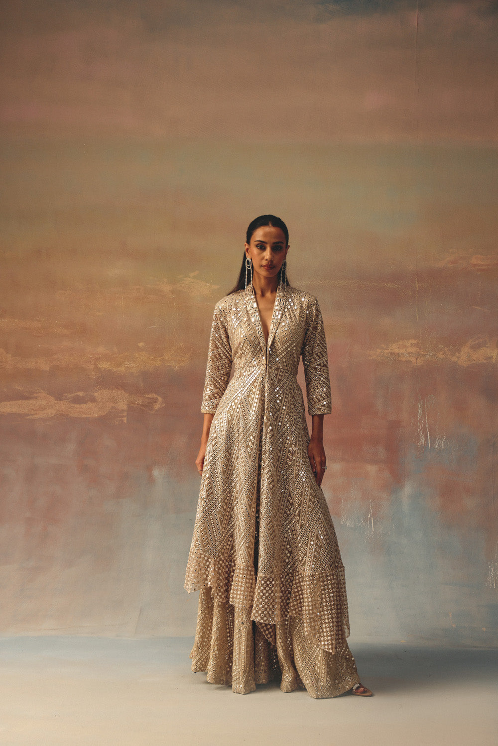 beadwork jaal at hemline is embroidered specially for us, with great care and precision. It gives the effect of mirrorwork. The garment is then styled at our Studio with the finest details.