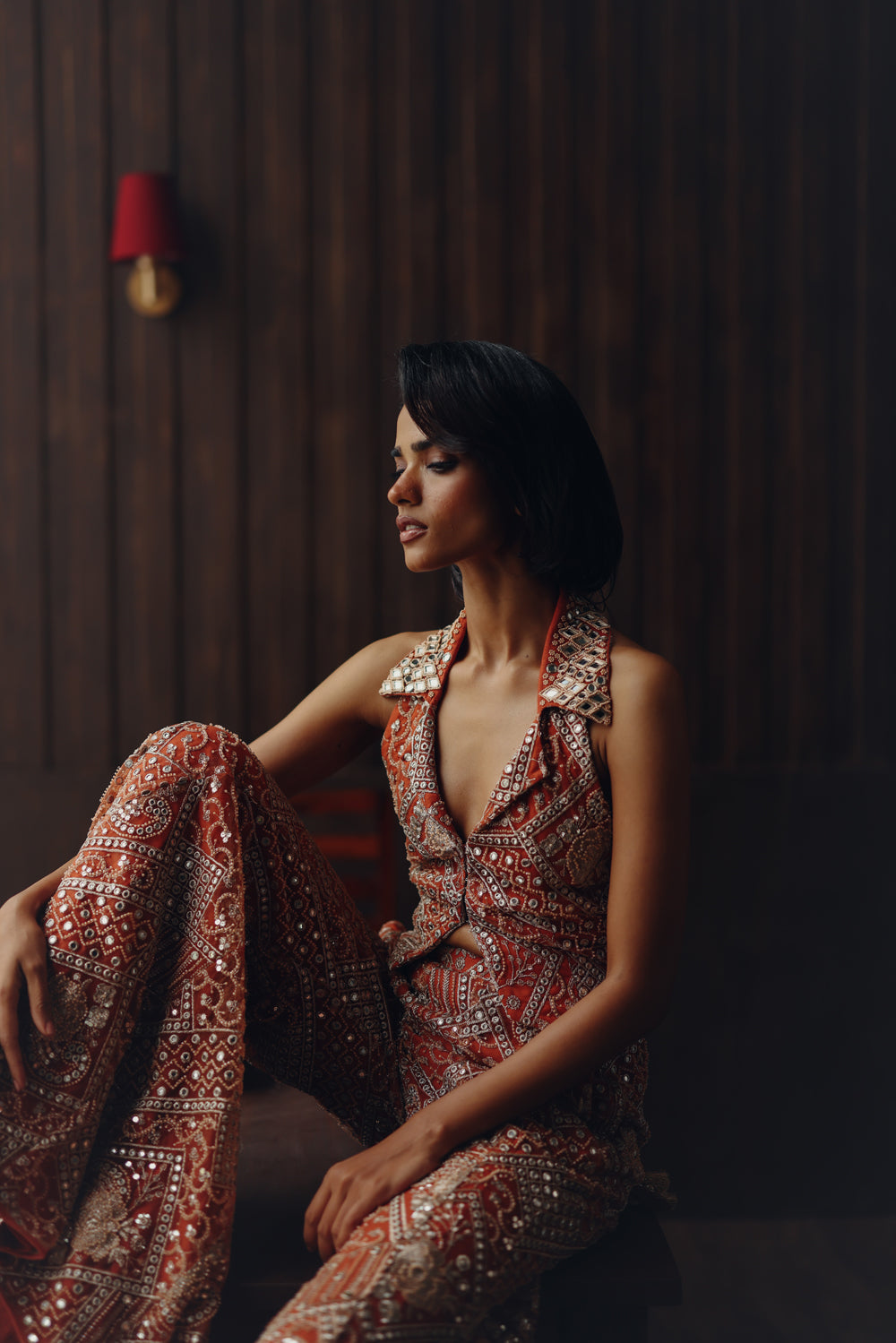 Hand embroidery embellished shirt collar backless waist coat with mirrorwork beadwork on tulle