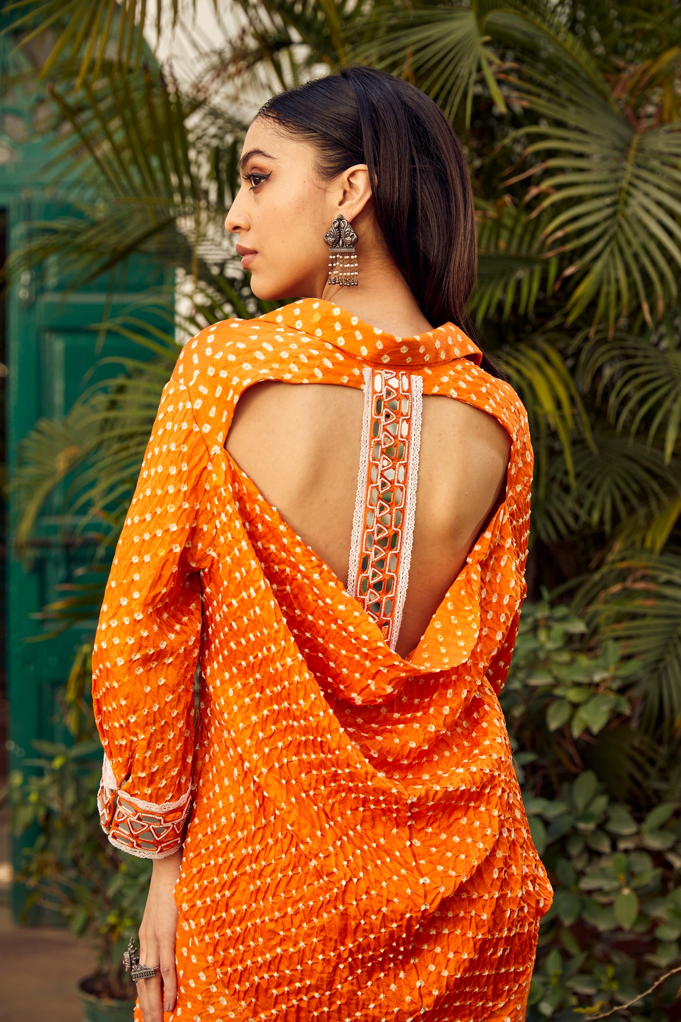 Fabric Details: Gajji Silk Bandhani is a hand tied and dyed fabric designed by us & crafted by master artisans in Kutch. It is crafted with great care and precision. The garment is then styled at our workshop with finest details.