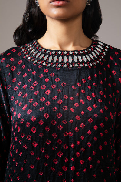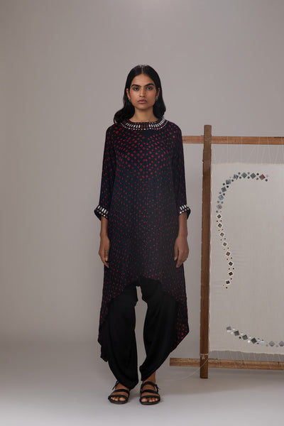 Details: Asymmetrica Gajji Silk Bandhani Tunic with Mirrorwork