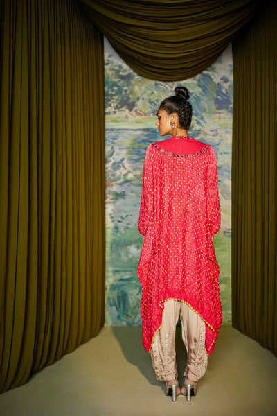 Rabari Asym Hi Neck Dress in Gajji Silk Bandhani With Dart Dhoti Pants
